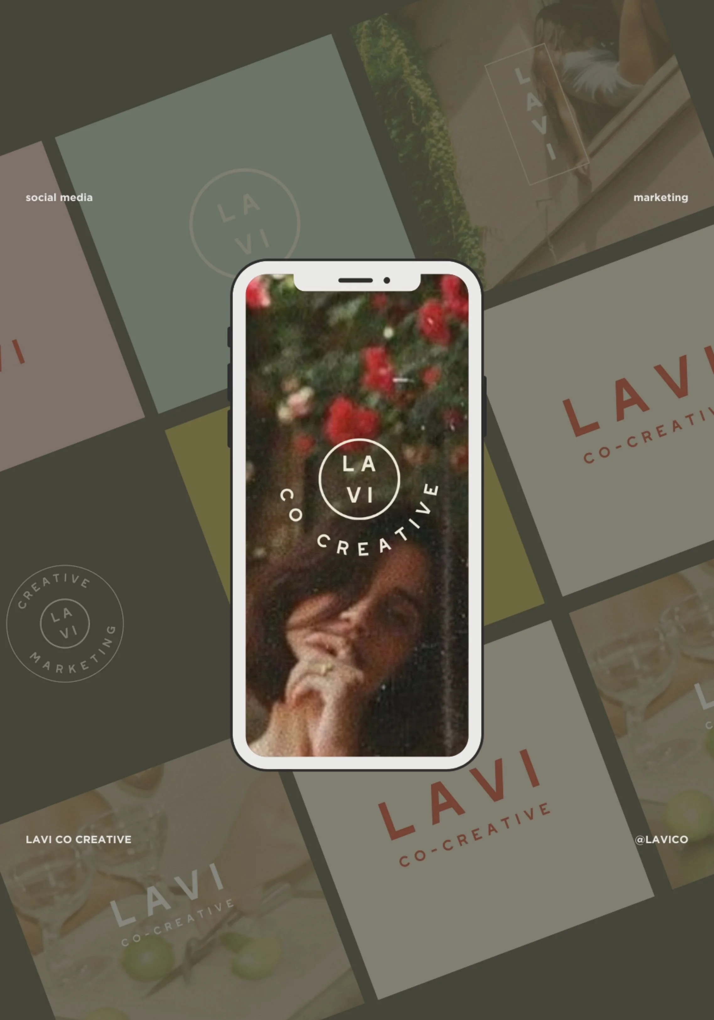Text "Lavi Co Creative Marketing" on beige background.