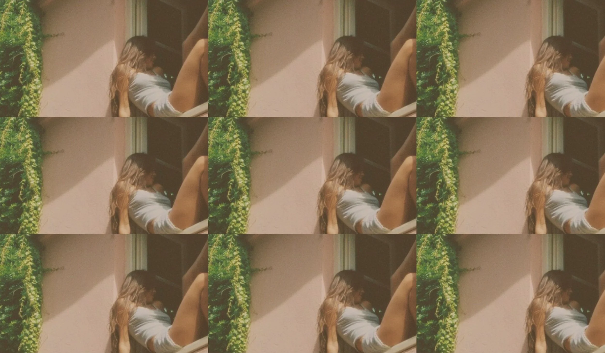 Stylized phone screen with a photo of a person leaning out of a window, surrounded by a pastel collage background featuring "LAVI Co-Creative" text and branding elements.