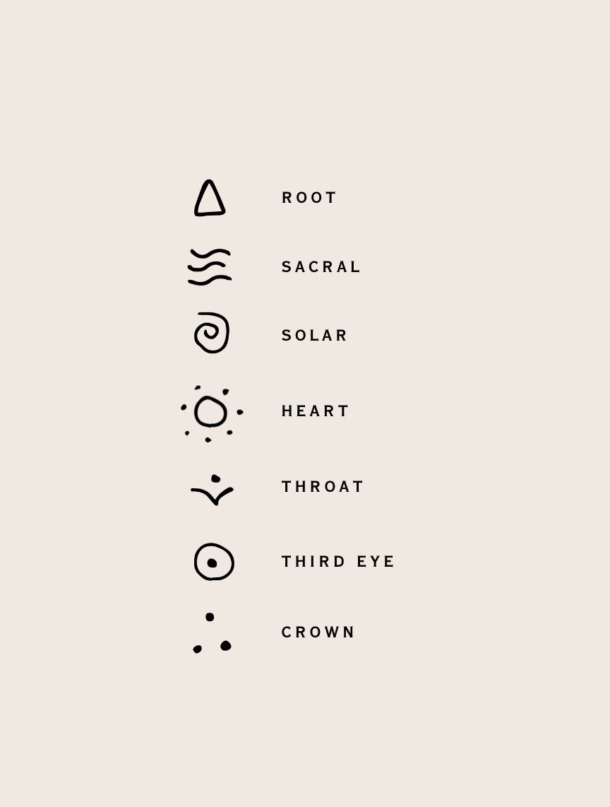 Diagram showing symbols for seven chakras: root, sacral, solar, heart, throat, third eye, and crown.