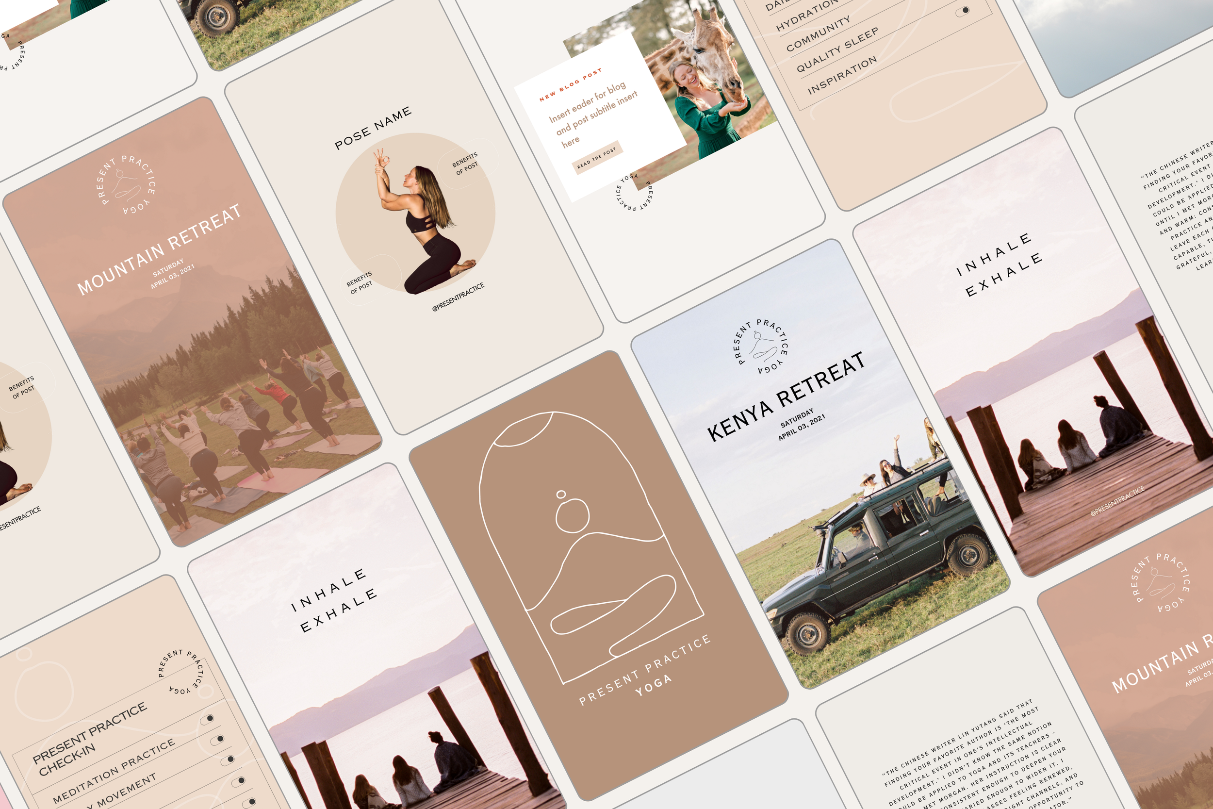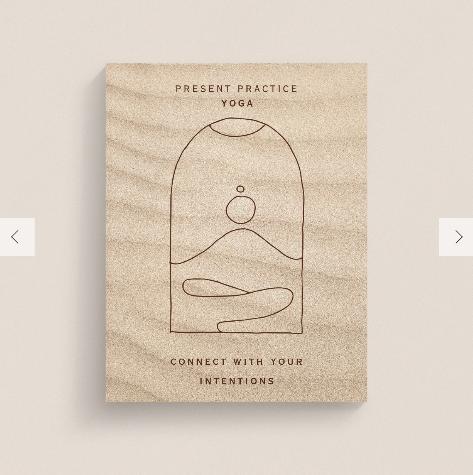 Minimalist yoga poster with abstract line art, featuring the text 'Present Practice Yoga' and 'Connect with Your Intentions' on a textured beige background.