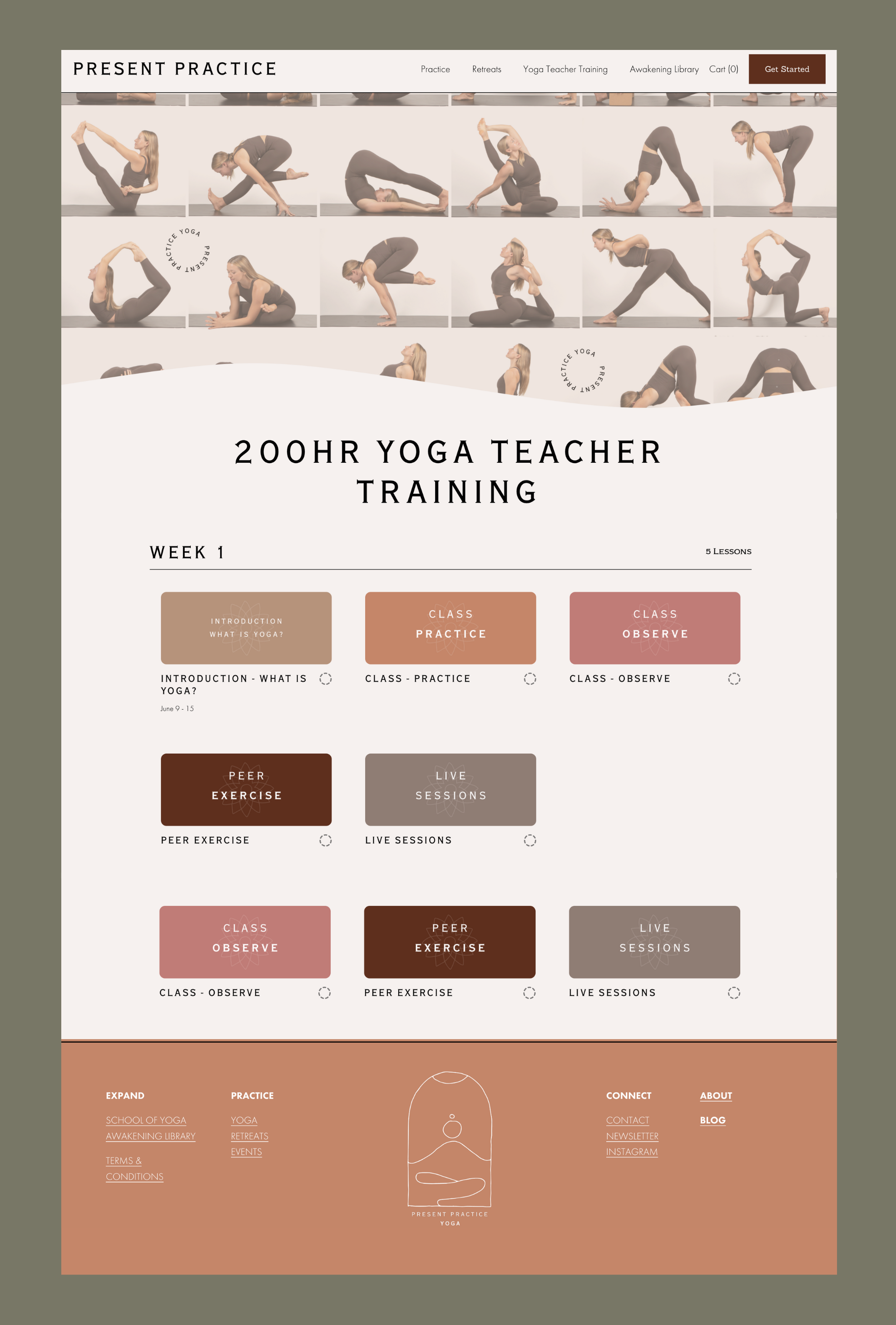 Webpage layout for Present Practice Yoga 200-hour teacher training. It includes sections for week 1 lessons such as Introduction, Class Practice, Class Observe, Peer Exercise, and Live Sessions. There are images of a woman demonstrating yoga poses in the top section.